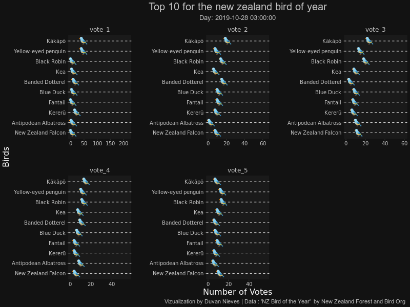 caption = "Vizualization by Duvan Nieves | Data : 'NZ Bird of the Year' by New Zealand Forest and Bird Org")+